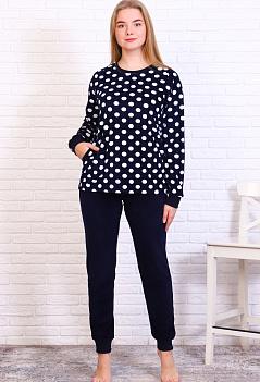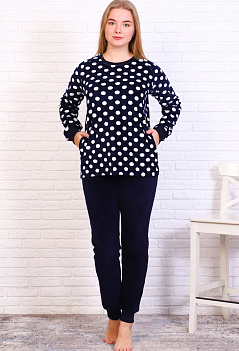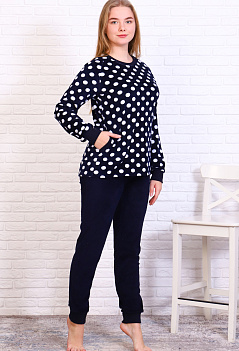 Красивый домашний костюм из бархатистого, очень приятного к телу велюра. Толстовка прямого кроя с длинным рукавом. Горловина, манжеты на рукавах и отделка карманов из эластичной рибаны. Брюки на манжетах, пояс на резинке. |