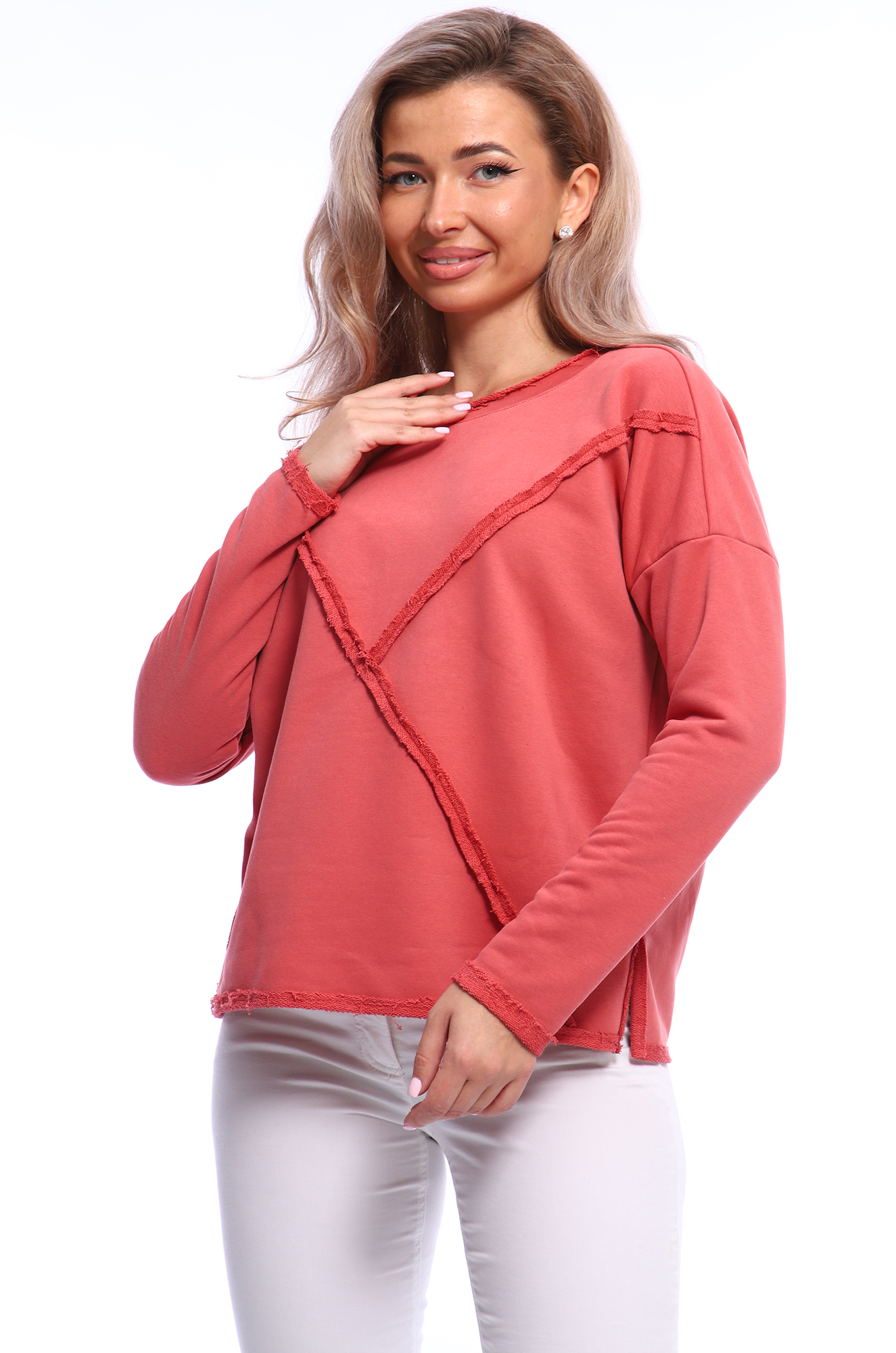 Стильный женский свитшот с длинным рукавом из футера без начеса. Особенность модели — швы наружу и разрезы по бокам придают вещи оригинальный дизайнерский вид и подчеркивают ее уникальность. Ткань футер 3-х нитка петля-диагональ, качество пенье, плотность 300-320 г/м2. Ткань приятная к телу и практичная в носке. |
